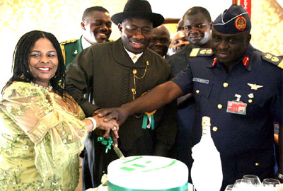 From left: First Lady, Dame Patience Jonathan; President Goodluck Jonathan; and Commander, Presidential Air Fleet, Air Commodore Adeshola Amosu, at President Jonathan's celebration of victory at the presidential primaries at Port Harcourt, yesterday. Photo: State House.